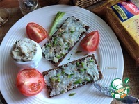 Намазала хлебцы бородинские "Щедрые". Намазывайте по вкусу. Я люблю не толстым слоем. Подала с помидором и присыпала зелёным луком и ещё немного поперчила перцем кайен. |