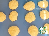 Тесто поднялось, и уже можно лепить изделия. Разделить тесто на одинаковые шарики. У меня вышло 10шт. Накрываем плёнкой и оставить на 15 минут. |