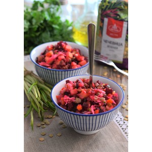 Описание: Если вам за зиму немного поднадоел обычный винегрет, один из самых популярных зимних салатов, попробуйте этот вариант любимого блюда. Замените фасоль или горошек на чечевицу, а репчатый лук на весеннюю травку, на черемшу. Очень вкусно! И привычное блюдо заиграет новыми интересными красками.