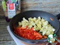 Добавить картофель и соломку болгарского перца, жарить 5 минут, перемешивая, огонь выше среднего. |