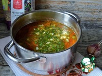 Зелень вымыть, обсушить, нарубить с чесноком, добавить в суп. Прокипятить, посолить по вкусу. Убрать с огня, дать настояться 10 минут, лавровый лист удалить. |