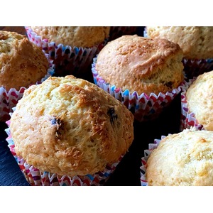 В муку добавляем сахар, разрыхлитель, ванильный сахар, изюм, цедру одного апельсина, растительное масло и апельсиновый сок из двух апельсин. Все перемешиваем, выкладываем в формы и отправляем в духовку, разогретую до 200 градусов на 30 минут.