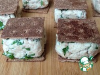 Шарики положить на кусочки хлебцев, сверху накрыть ещё кусочком хлебца. |
