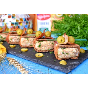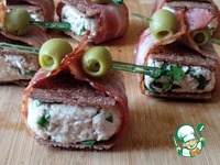 Затем обернуть полосками бекона и закрепить шпажками с оливками. У меня получилось 9 шт. |