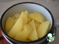 Помойте и почистите картофель. Нарежьте его дольками, залейте холодной водой. Доведите до кипения и варите 5 минут. Откиньте на дуршлаг. |