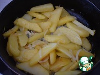 Разогрейте подсолнечное масло на сковороде, слегка обжарьте картофель. Добавьте сливочное масло и нарезанный репчатый лук. Посолить, поперчить и жарить до готовности картофеля минут 20-25. |