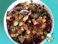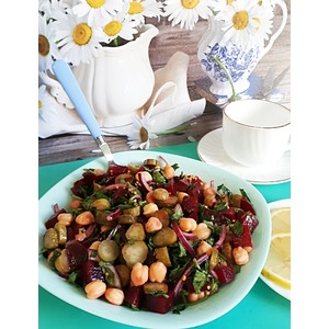 Описание: Это очень вкусный, сытный, полезный и яркий салат. Даже те, кто не очень любит свеклу, непременно захотят его попробовать. Рекомендую добавлять в салат именно красный лук, он делает салат неповторимым, а нут отлично сочетается со свеклой и другими ингредиентами. А тот факт, что сейчас пост, делает этот салат еще более востребованным.