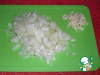 В разогретую сковороду наливаем растительное масло. Выкладываем нарезанные лук и чеснок. Обжариваем до золотистого цвета на среднем огне. |