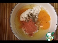 В миску вбил 2 кур. Яйца добавил 6 ст. л сметаны, затем соль перец укроп сушеный и паприку, все хорошо перемешал. |