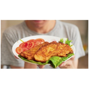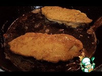 3) Разогрел сковородку с растительным маслом. Отбитое куриное филе отпустил в кляр, обвалял его в двух сторону, далее переложил в сковороду. И обжаривал по 2 – 3 минуты до корочки. |