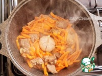 К поджаренному мясу добавить подготовленные сухофрукты. Перемешаем. Мясная начинка готова |