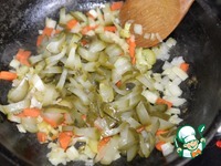 Солёные огурцы режем тонкими полосками, кладём к овощам, обжариваем 5 минут на среднем огне. |