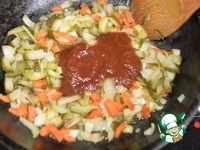 Кладём томатную пасту, обжариваем ещё 5 минут на среднем огне. |