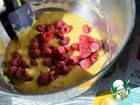 Всыпать муку, смешать до однородности. Аккуратно вмешать малину. |