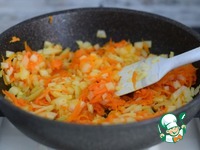 Морковь натереть на крупной терке и обжарить в разогретом растительном масле пару минут. Огонь активный. |