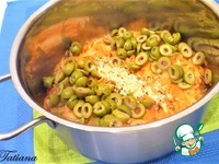 Оливки без косточки нарежьте колечками, добавьте в кастрюлю к овощам, так же добавьте сушеные (измельченные овощи). Готовьте под крышкой еще минут 5-7. |