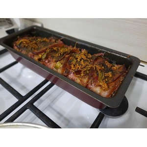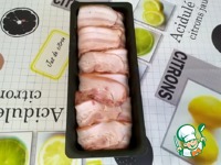 Прямоугольную форму для запекания промасливаем. У меня размером 30 х 11 см Пластины грудинки выкладываем внахлест так, чтобы края свисали с бортиков формы. |