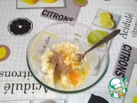 Разбиваем яйцо. Добавляем цедру апельсина, апельсиновый сок, 1 столовую ложку молотого миндаля, 1/4 чайной ложки розмарина. Хорошо перемешиваем. |