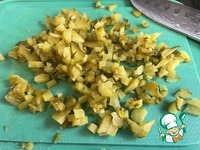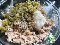 Смешайте тунца, соленые огурчики, майонез, сахар, горчицу и перец. |