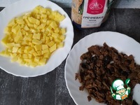 Грибы сушеные замочить на ночь. Затем промыть, отварить в течении получаса, остудить и нарезать произвольно. Картофель очистить и нарезать кубиками. |