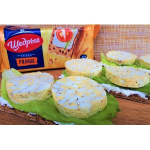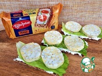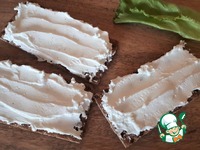 На хлебцы намазываем творожный сыр, укрываем листьями салата, сверху выкладываем кружочки яичной колбаски. |