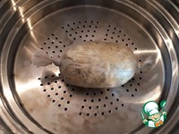 Яичную массу выкладываем на пищевую плёнку, туго скручиваем в колбаску. Кипятим воду в пароварке, выкладываем колбаску в пароварку и варим 15 минут на активном огне. |