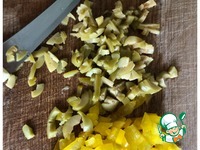 Мелким кубиком нашинковать перец и оливки. Выложить в салатник. |