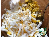 Добавить сметнану, молотый перец. Яйца нарезать небольшим кубиком. |