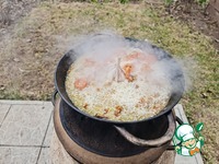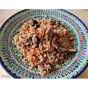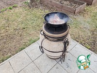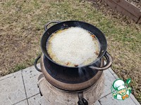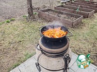 Добавляем сухофрукты и морковь. Не ленимся и морковь нарезаем брусочками. Обжариваем. Жарим всё почти до готовности. Чтобы зира раскрыла свой аромат, разбиваем её в ступке. Зиру, барбарис и соль отправляем в вок и наливаем воду, чтобы она покрыла всё примерно на толщину пальца 1,5-2 см. Делаем минут 20-30 на огне, покрыв крышкой. Чеснок максимально чистим, но оставляем в шкурке, снизу немного срезаем, но чтобы он не развалился на зубчики. Выкладываем в вок вместе с перцем жгучим и готовим ещё минут 15. Это мы приготовили зирвак. Для вкусного плова очень важный момент. |