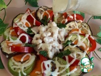 Морковь нарезать тонко кружочками, болгарский перец нарезать полосками. Все овощи красиво уложить на тарелке. |