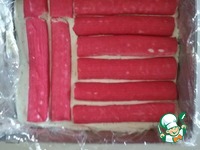 Выложить немного творожной массы. Сверху разместить крабовые палочки. |