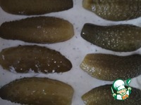 Залить ещё частью творожной массы. Огурцы разрезать вдоль на 2 части и уложить в форму. |
