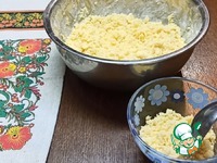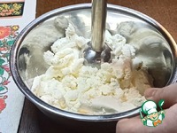 Для второй части начинки смешиваем 600 г творога (жирность9%), 50 г сахара и 30 г кукурузного крахмала. Для получения более нежной консистенции можно пробить массу блендером. |
