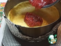 Поверх теста выкладываем уже остывшую ягодную начинку и равномерно распределяем её. Перед тем, как будем выкладывать творожную начинку, ставим разогревать духовку до 180 градусов. |
