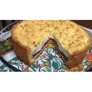 Поверх ягодной выкладываем творожную начинку и распределяем её. Достаем из холодильника раннее оставленную крошку и посыпаем пирог. |