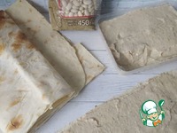 Лаваш порежьте на полоски удобные для дальнейшего сворачивания. Я разрезала на 35х25см. Намажьте паштет на лаваш. Сверните в рулет. И нарежьте ножом-пилкой на порционные куски. |