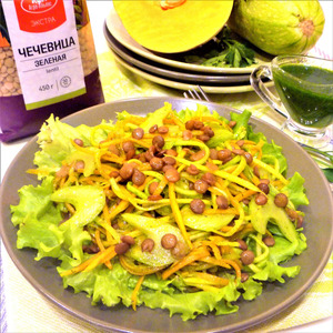 Описание: Яркий и очень витаминный салат из сырых овощей и бархатистой зеленой чечевицы.