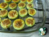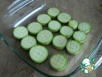 Кабачки порежем кружочками, надрежем верх крест накрест. Выложим в форму. |