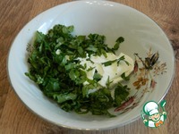 В это время нарежем кинзу или другую зелень, которую Вы любите, смешаем с творожным сыром. |