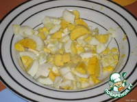 Крабовые палочки нарезать кубиками. Яйца порубить (не мелко). |