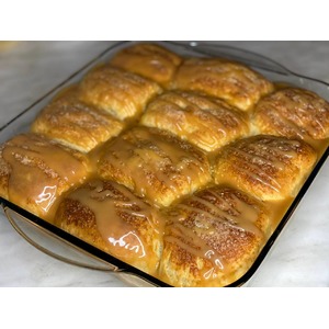 Сверху смазываем растопленным сливочным маслом, присыпаем сахаром и отправляем в духовку, разогретую до 190 градусов на 35-45 минут, все зависит от духовки. Должны пропечься, подняться еще и красиво подрумяниться.
