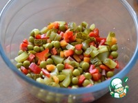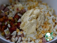 В отдельной миске смешать буженину, овощи, яйца. Добавить майонез, перец, соль. Влить желатин. Аккуратно перемешать. |