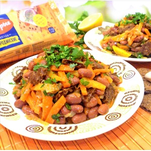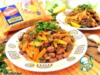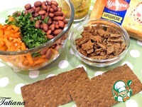 Выложите фасоль в миску, к фасоли добавьте обжаренные (горячие) овощи вместе с маслом, в котором жарились овощи, перемешайте. Вымытую петрушку порубите, добавьте к фасоли с овощами. Хлебцы "Щедрые (бородинские) поломайте на кусочки, добавьте в салат, перемешайте. Дайте салату постоять минут 30. Хлебцы пропитаются овощным соком, немного смягчатся.