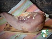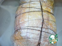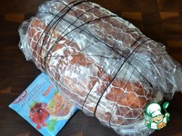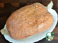 Варить при 75-80 градусах, на самом медленном кипении, с приоткрытой крышкой, 2 часа. Затем охладить в холодной воде со льдом. Убрать верхний "панцирь", оставив бинт. |