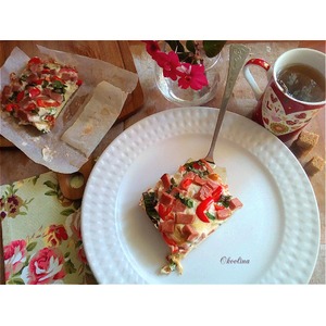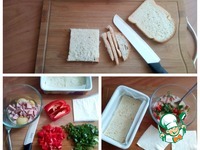 Берём форму подходящую, в которую поместится 2 куска пшеничного хлеба в нарезке, предварительно срезать с них корочки. Форму застелила пекарской бумагой, т к масло никакое не буду использовать. Колбасу, перец болгарский нарезаем на небольшие кубики. Лук зелёный режем мелко. На дно формы укладываем хлеб. В посуду выкладываем порезанные колбасу, болгарский перец и лук. Разбиваем яйца, солим и перчим по вкусу. Если есть будут дети, то не перчите. Это сделать можно у себя в тарелке. Вилкой перемешиваем не усердно. |