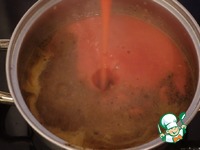 Заливаем куриный бульоном, и томатами в собственном соку, кипятим минут 5, соус должен получиться слегка густой |