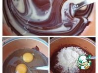 В растопленный шоколад постепенно ввести сгущенку, перемешивая до однородности. Вбить яйца, снова перемешать. Добавить муку, тщательно перемешать получившуюся смесь. |