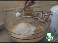 Потом добавляем стакан кефира и стакан любого варенья, размешаем. Всыпаем в два приёма муку, добавляем разрыхлитель. У нас получается жидковатое тесто. |
