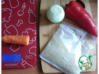 Готовим продукты для риса. Все продукты у меня взвешены. Перец сладкий красный разрезала пополам и буду использовать половинку. |