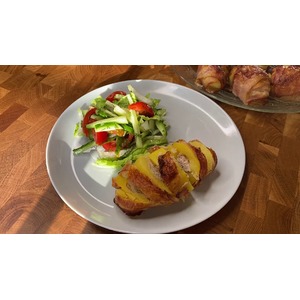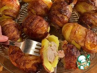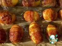 Заполнить картофельные половинки фаршем и соединить. Завернуть каждую картошку в бекон и смазать майонезом. |